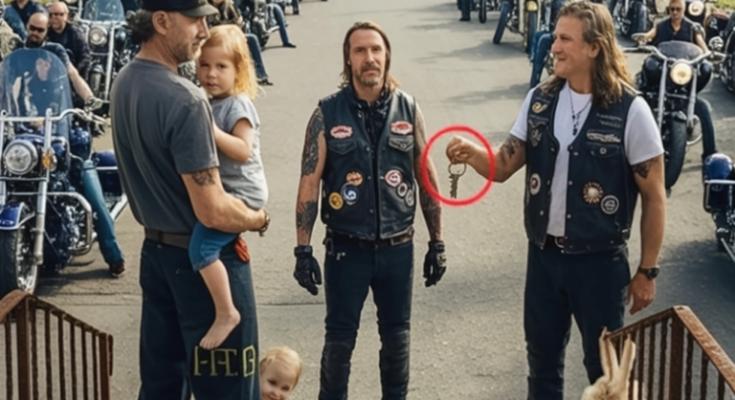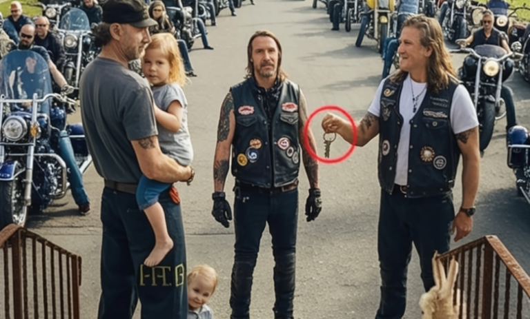 Months later, on Christmas Eve, the bikers returned—forty engines roaring down the street again. This time they weren’t there for Adam. They came for Lily. They presented her with a custom pink leather jacket, her name embroidered in gold, and a helmet glittering with flames. “Little Rivers,” Ridge said softly. “You’re family now.”